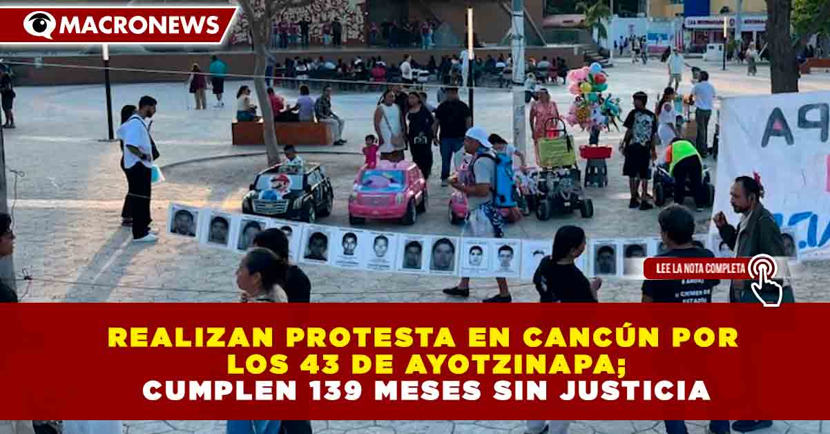 Redacción Macronews.- Colectivos y activistas se manifestaron en Cancún en solidaridad con las madres y padres de los 43 normalistas de Ayotzinapa, al cumplirse 139 meses de su desaparición, un caso que continúa sin resolverse y mantiene vigente la exigencia de verdad y justicia.