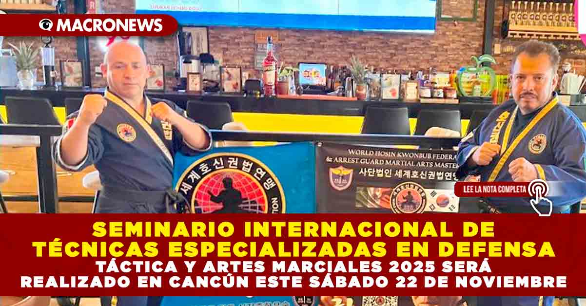 Redacción Macronews.- Este sábado 22 de noviembre, Cancún será sede del Seminario Internacional de Técnicas Especializadas en Defensa Táctica y Artes Marciales 2025, evento que reunirá a maestros internacionales y líderes mundiales del arte marcial Hosin Kwonbub en el gimnasio Kuchil Baxal. La jornada forma parte de la Gira Nacional “Legado de Combate”, que recorrerá Cancún, Ciudad de México, Puebla, Monterrey y otras ciudades estratégicas, con actividades de formación, certificación y acreditación para cintas negras.