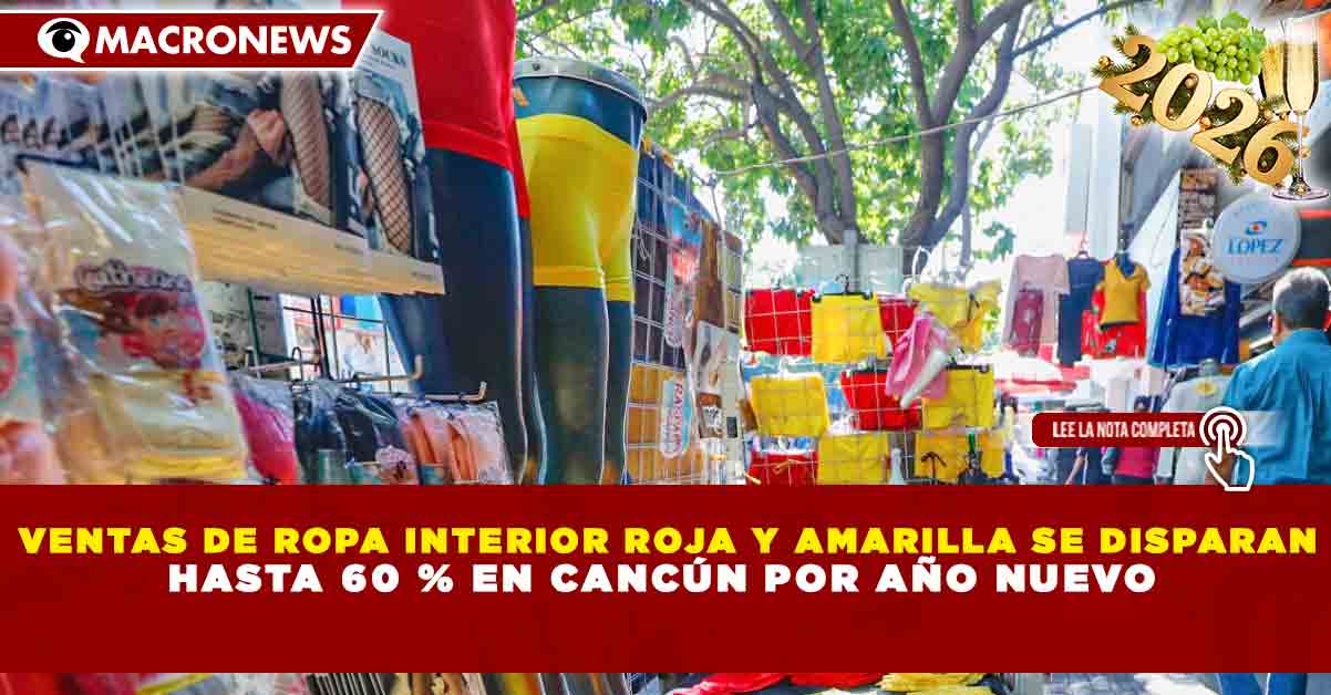 Redacción Macronews.- Las ventas de ropa interior roja y amarilla se han incrementado hasta un 60 % en tiendas y puestos de Cancún en los últimos días, impulsadas por la tradición de recibir el Año Nuevo con estas prendas para atraer amor y dinero, dijeron comerciantes locales. Esta tendencia refleja una fuerte demanda vinculada a las supersticiones que cobran fuerza en diciembre.