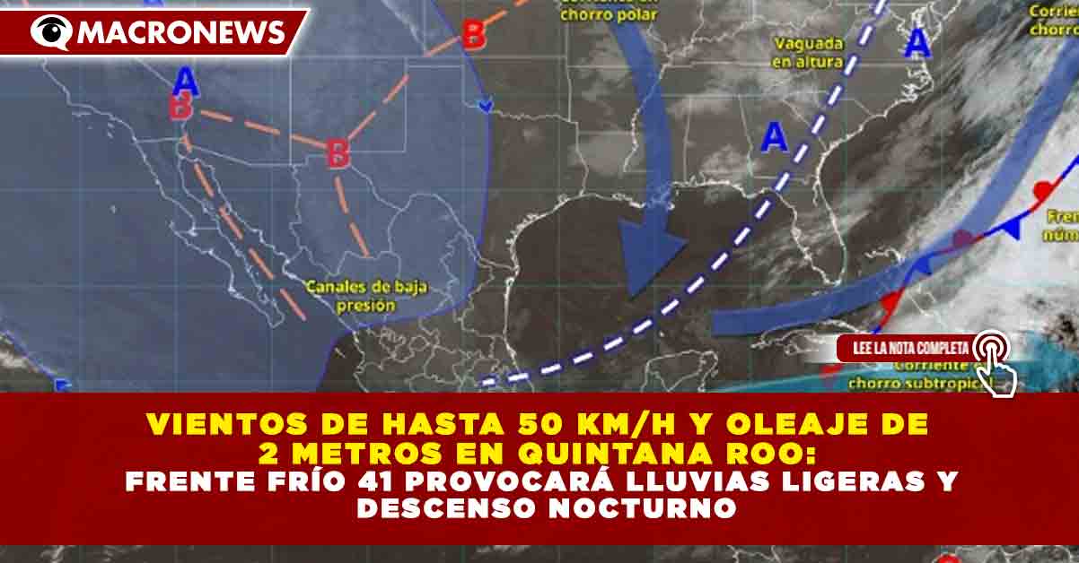 Redacción Macronews.- Quintana Roo registrará este jueves condiciones climáticas mayormente estables, aunque con efectos del frente frío número 41 que provocarán rachas de viento de hasta 50 km/h, oleaje elevado y lluvias aisladas en distintas zonas del estado.