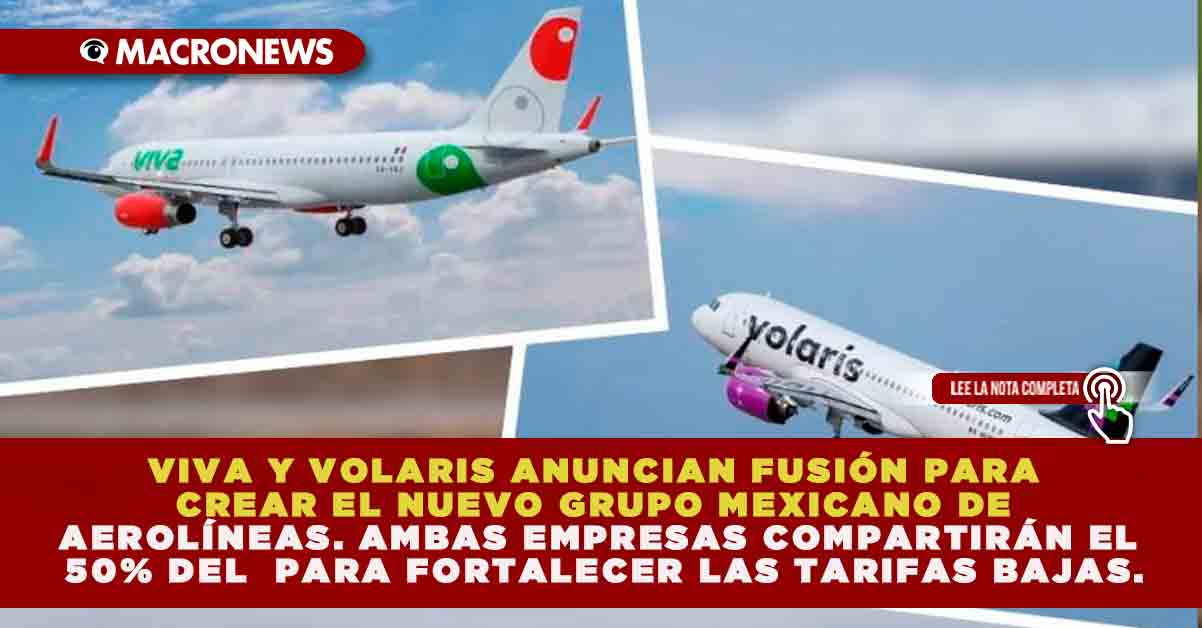 VIVA Y VOLARIS ANUNCIAN FUSIÓN PARA CREAR EL NUEVO GRUPO MEXICANO DE AEROLÍNEAS. AMBAS EMPRESAS COMPARTIRÁN EL 50% DEL CAPITAL PARA FORTALECER LAS TARIFAS BAJAS.