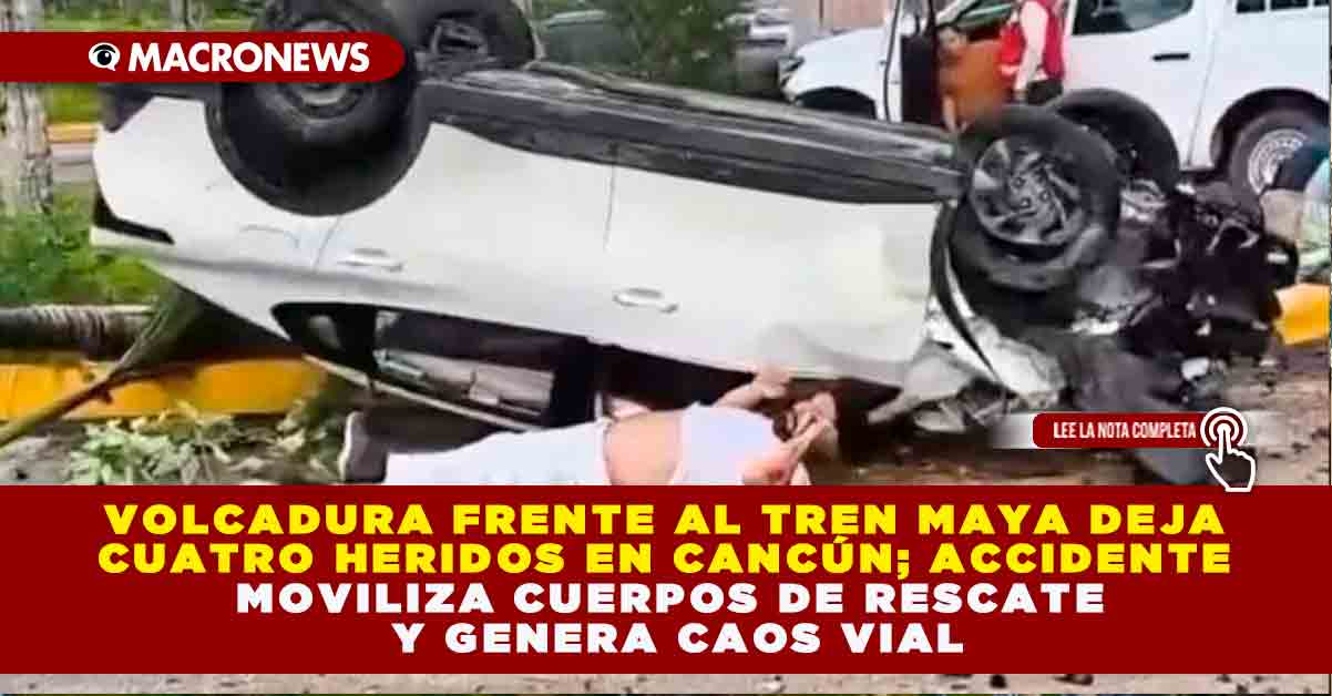 Volcadura frente al Tren Maya deja cuatro heridos en Cancún; accidente moviliza cuerpos de rescate y genera caos vial