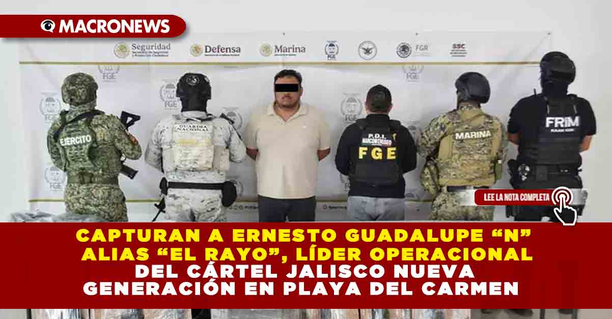 La Fiscalía General del Estado de Quintana Roo informó la captura de Ernesto Guadalupe “N”, alias “El Rayo”, identificado como presunto líder operacional del CJNG en Playa del Carmen y considerado objetivo prioritario dentro del Atlas Delictivo estatal. La detención ocurrió la tarde del martes 25 de noviembre durante un operativo del Grupo Interinstitucional en el municipio de Benito Juárez.