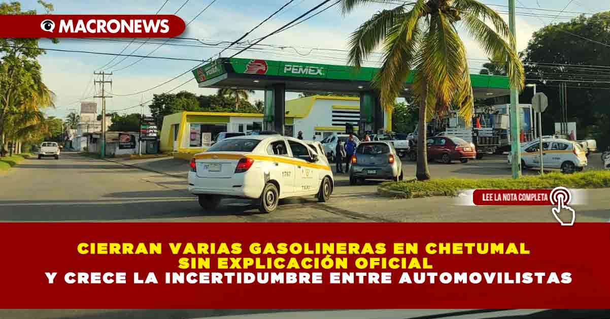 CHETUMAL, 16 de octubre. – La mañana de este jueves, conductores de la capital del estado reportaron el cierre simultáneo de al menos tres gasolineras en Chetumal, situación que ha comenzado a generar preocupación entre los automovilistas y transportistas locales. Los establecimientos que permanecen fuera de operación, algunas con mallas y lonas, mientras que otras con cintas amarillas, se ubican en puntos estratégicos de la ciudad: avenida Belice con Insurgentes, Aarón Merino Fernández con Insurgentes, y Erick Paolo Martínez con Magisterio. No se descarta que con el paso del día cierren otras.