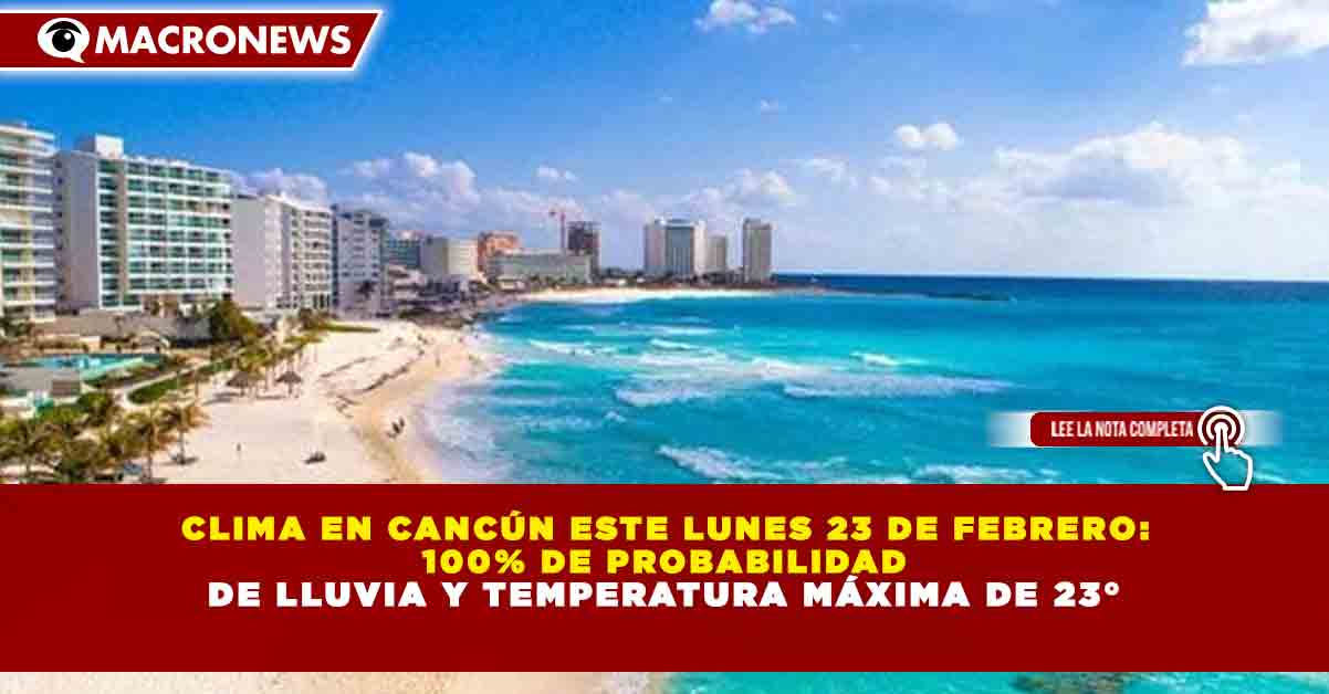 Redacción Macronews.- El pronóstico del clima en Cancún para este lunes 23 de febrero indica lluvias moderadas durante toda la jornada, con una temperatura máxima de 23 grados y mínima de 20 grados, según reportes meteorológicos locales.