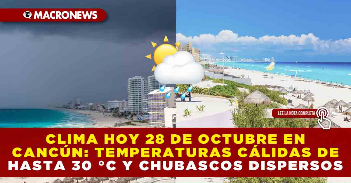 Redacción Macronews.- Este martes 28 de octubre de 2025, el clima en Cancún, Quintana Roo, se caracteriza por condiciones cálidas y parcialmente nubladas, con una temperatura máxima estimada de 30 °C y mínima de 25 °C. La sensación térmica podría alcanzar hasta 33 °C debido a la alta humedad relativa, que se mantiene en niveles elevados durante el día. Se prevé una probabilidad de lluvias del 60%, con chubascos dispersos a lo largo del día. El viento será moderado, con rachas de hasta 36 km/h provenientes del norte.