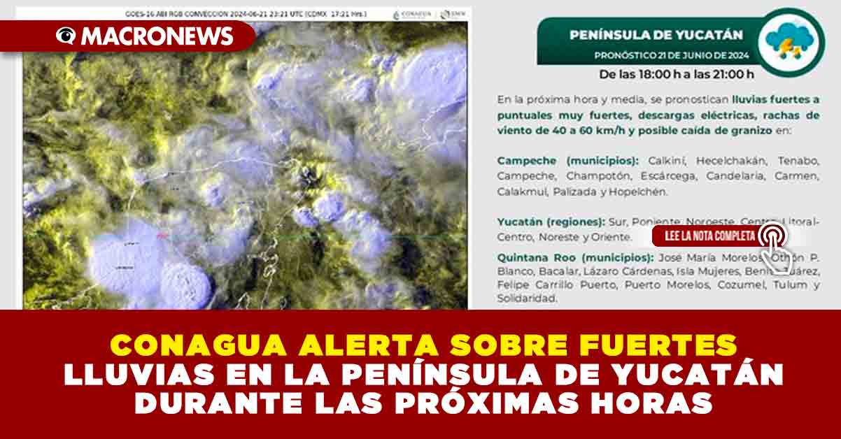 REDACCIÓN MACRONEWS: Ciudad de México. La Comisión Nacional del Agua (CONAGUA) emitió una alerta meteorológica debido a la previsión de condiciones climáticas severas en la Península de Yucatán durante las próximas horas. Según el comunicado difundido a través de su cuenta oficial de Twitter, se esperan lluvias fuertes a puntuales muy fuertes, acompañadas de descargas eléctricas, rachas de viento de 40 a 60 km/h y posible caída de granizo en los estados de Campeche, Yucatán y Quintana Roo.