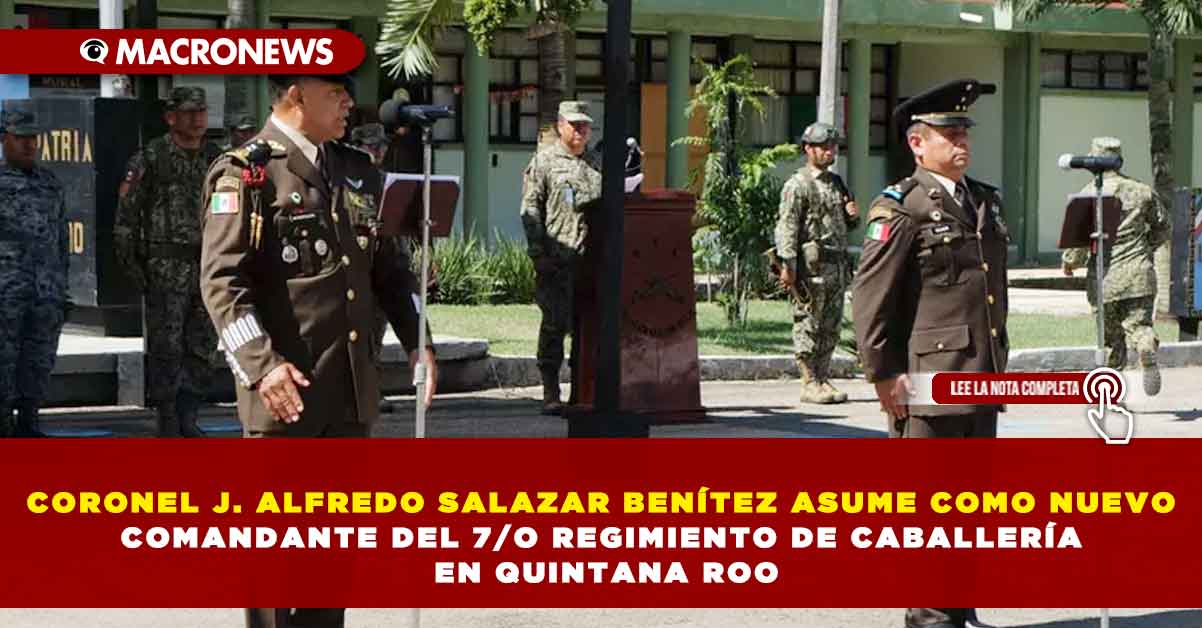 La Secretaría de la Defensa Nacional (Sedena), a través de la X Región Militar y la 34/a Zona Militar, informó que el Coronel de Caballería J. Alfredo Salazar Benítez asumió este 1 de septiembre de 2025 el cargo como Comandante del 7/o. Regimiento de Caballería, tras recibir la Toma de Posesión al Cargo y Protesta de Bandera, en ceremonia encabezada por el General de Brigada de Estado Mayor Fidel Mondragón Rivero.