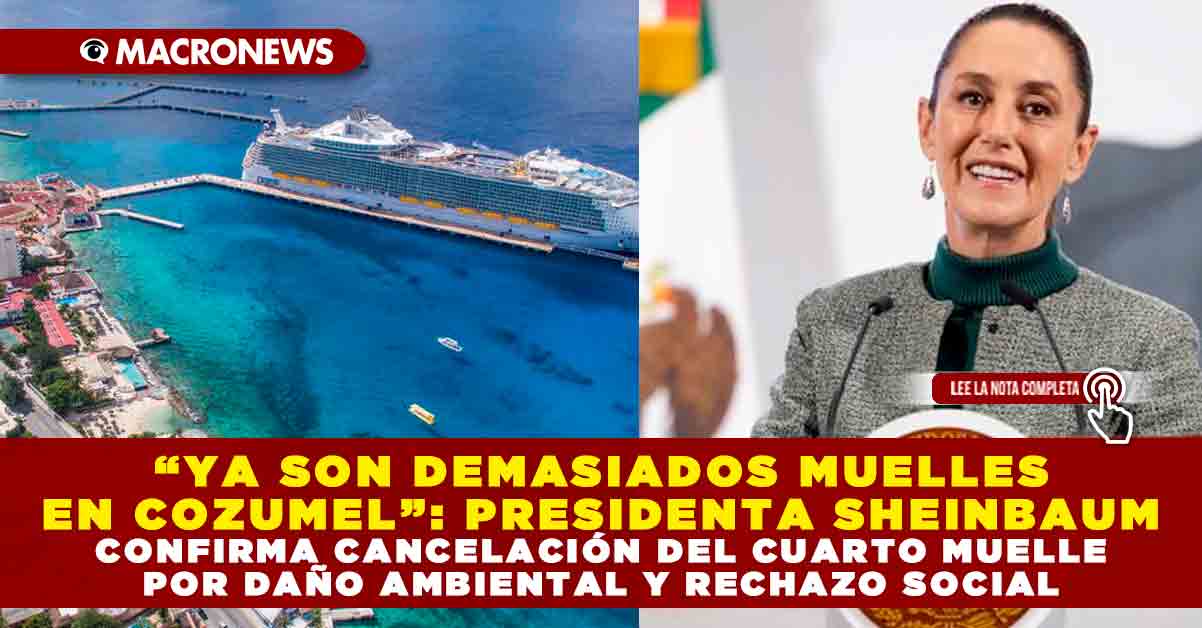 Redacción Macronews.- La presidenta de México, Claudia Sheinbaum, anunció este lunes que no se construirá un cuarto muelle turístico en Cozumel, tras la revocación de la autorización de impacto ambiental por parte de la Secretaría de Medio Ambiente y Recursos Naturales (Semarnat). “Ya son demasiados muelles en Cozumel y además pudiera dañarse el arrecife”, declaró la mandataria, subrayando que la decisión se tomó con base en criterios técnicos y en la oposición mayoritaria de la comunidad local.