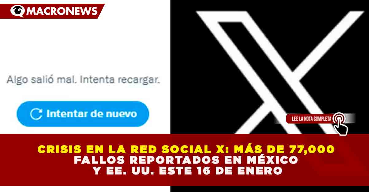 Redacción Macronews.- La plataforma digital X (anteriormente Twitter) experimentó una interrupción masiva en sus servicios durante la mañana de este viernes 16 de enero de 2026, afectando principalmente a usuarios en México y Estados Unidos. De acuerdo con el portal especializado DownDetector, el pico de la contingencia se registró a las 09:15 horas, contabilizando más de 2,200 reportes en territorio mexicano y una cifra alarmante superior a las 77,000 incidencias en el país vecino. Las estadísticas revelan que el 60% de las fallas se concentraron en la aplicación móvil, mientras que un 30% de los usuarios manifestaron dificultades para acceder a través de la versión de escritorio, evidenciando una inestabilidad sistémica en la infraestructura de la red social.