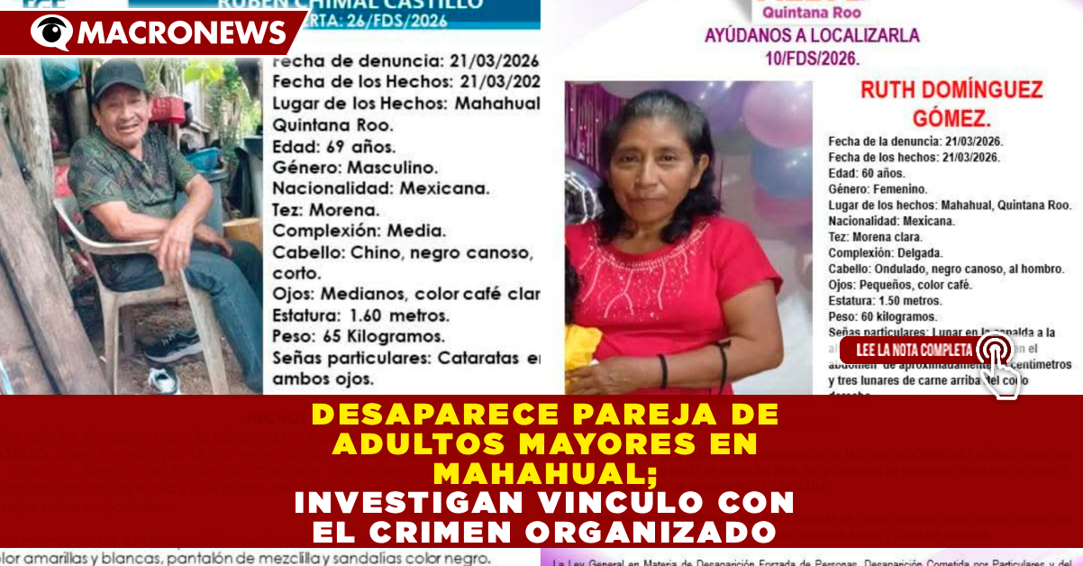 MAHAHUAL / OTHÓN P. BLANCO. – La Fiscalía General del Estado (FGE) ha activado protocolos de búsqueda urgente tras la privación de la libertad de Ruth Domínguez Gómez y Rubén Chimal Castillo, una pareja de adultos mayores vistos por última vez el pasado sábado 21 de marzo. El incidente ocurrió en la zona de Río Indio, una franja costera de Mahahual que, de acuerdo con las primeras indagatorias oficiales, es considerada un punto crítico para el trasiego de narcóticos provenientes de Sudamérica. Las autoridades no descartan que este hecho esté vinculado a actividades de grupos delictivos que operan en la región. Mientras los operativos por aire y tierra se intensifican en la selva y brechas aledañas, la comunidad local expresa su consternación ante la vulnerabilidad de sus habitantes.