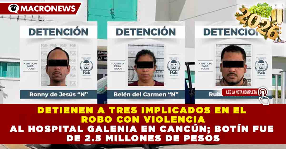 Redacción Macronews.- La Fiscalía General del Estado (FGE) de Quintana Roo informó la detención de tres personas presuntamente implicadas en el delito de robo con violencia cometido en el Hospital Galenia de Cancún, durante la madrugada del 29 de enero, hecho en el que se habría sustraído un monto aproximado de 2.5 millones de pesos en efectivo.