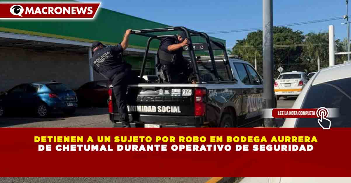 Redacción Macronews.- Un hombre fue detenido por el presunto delito de robo al interior de una tienda Bodega Aurrera en la ciudad de Chetumal, luego de ser sorprendido cuando intentaba sustraer mercancía sin realizar el pago correspondiente, informaron autoridades de seguridad.
