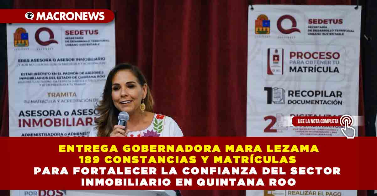 Playa del Carmen.- Al entregar 189 constancias y matrículas a profesionales inmobiliarios, la gobernadora Mara Lezama Espinosa expresó que se trata de una nueva página en la historia del desarrollo de esta actividad, específicamente en la Riviera Maya, donde el crecimiento no se detiene.
