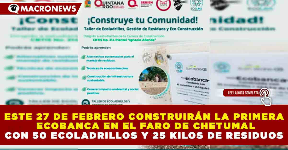 Redacción Macronews.- Pasado mañana viernes 27 de febrero se llevará a cabo la construcción de la primera Ecobanca en el Faro de Chetumal, iniciativa impulsada por la asociación civil Ecoliiks, en coordinación con estudiantes del CBTIS 214 y colaboradores del Sistema Quintanarroense de Comunicación Social.
