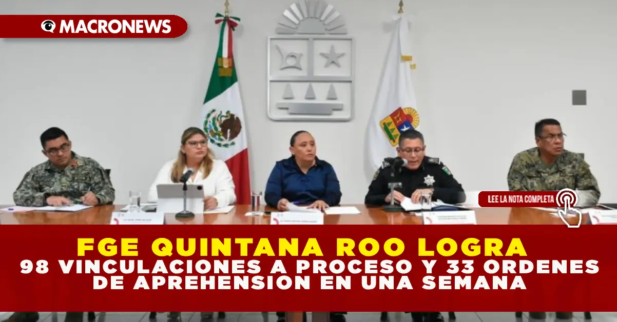 La Fiscalía General del Estado de Quintana Roo (FGE) informó que, entre el 1 y el 7 de diciembre de 2025, obtuvo 98 vinculaciones a proceso, cumplimentó 33 órdenes de aprehensión y ejecutó 12 cateos por delitos diversos, en el marco de la conferencia del Gabinete de Seguridad realizada en Othón P. Blanco. La presentación estuvo a cargo de la Fiscal de Distrito Sur, Arochi de los Ángeles Lugo Arana, en representación del Fiscal General Raciel López Salazar.