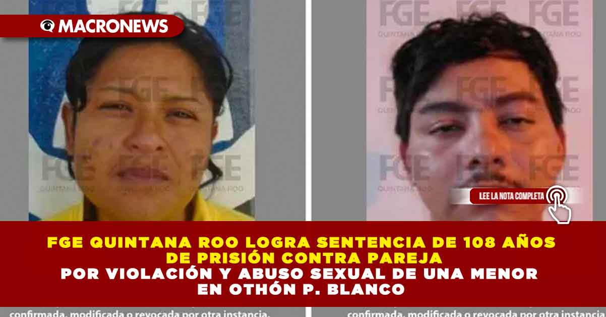 La Fiscalía General del Estado (FGE) de Quintana Roo informó que logró una sentencia condenatoria de 108 años y seis meses de prisión contra una pareja responsable de cometer delitos de violación y abuso sexual en agravio de una menor de edad en el municipio de Othón P. Blanco.