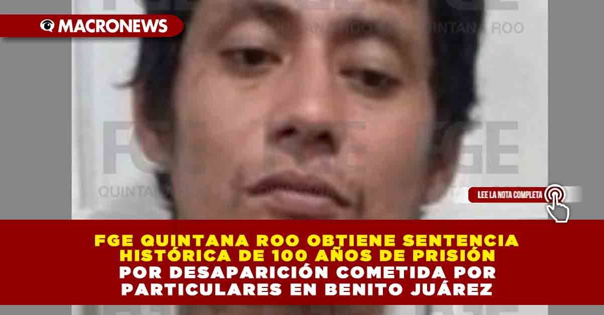 Redacción Macronews.- La Fiscalía General del Estado de Quintana Roo (FGE) logró una sentencia ejemplar de 100 años de prisión contra José Asterio Triano Castillo, declarado culpable del delito de desaparición cometida por particulares en agravio de dos hombres, cuyos nombres permanecen bajo reserva. El fallo fue emitido por un Juez de Juicio Oral, tras analizar las pruebas presentadas por la Fiscalía, las cuales acreditaron plenamente la responsabilidad penal del sentenciado.