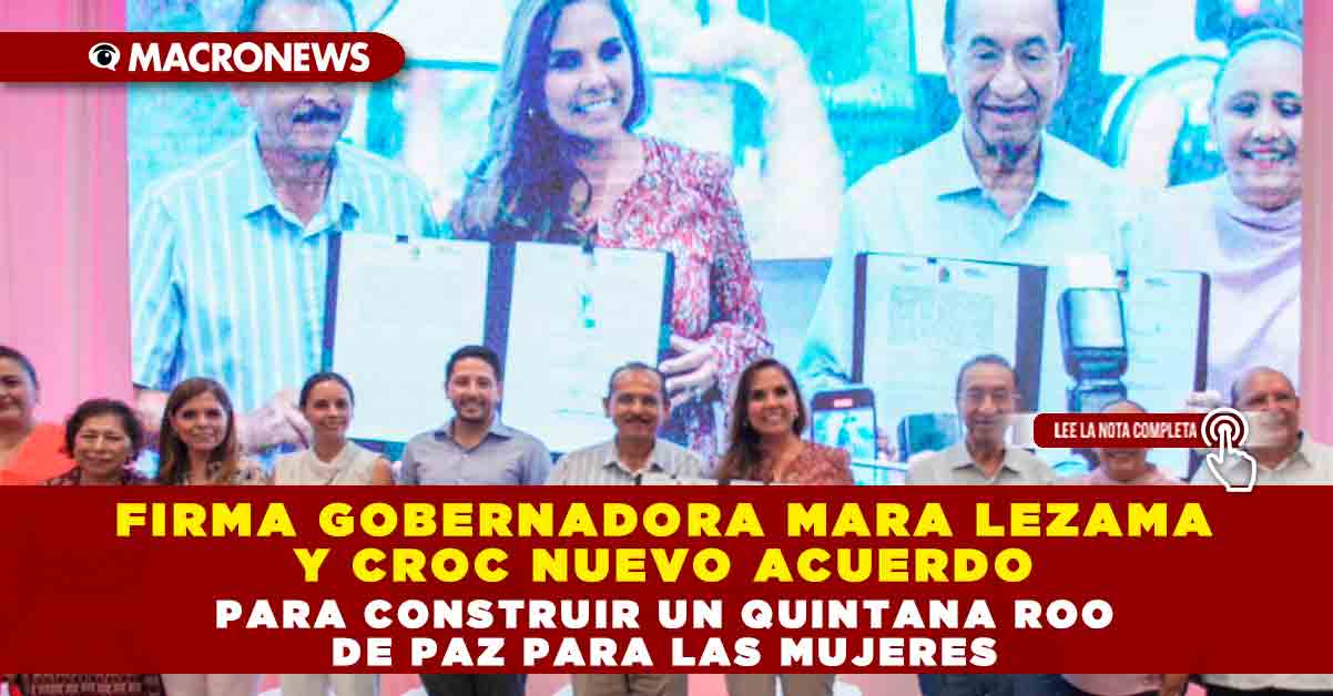 Cancún.- La gobernadora Mara Lezama Espinosa y el secretario nacional de la CROC Isaías González Cuevas firmaron un acuerdo solidario en materia de colaboración sindical para la construcción de Quintana Roo como destino 100% seguro, a través del fortalecimiento y promoción de la cultura de la denuncia y la participación ciudadana.