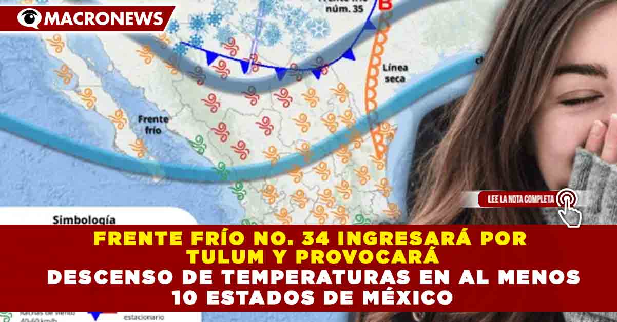 Redacción Macronews.- El Frente Frío número 34 ingresará al territorio nacional por la zona sur de Quintana Roo, específicamente por Tulum, generando afectaciones en gran parte de México, con descenso de temperaturas, lluvias intensas y rachas de viento, de acuerdo con los primeros reportes meteorológicos.