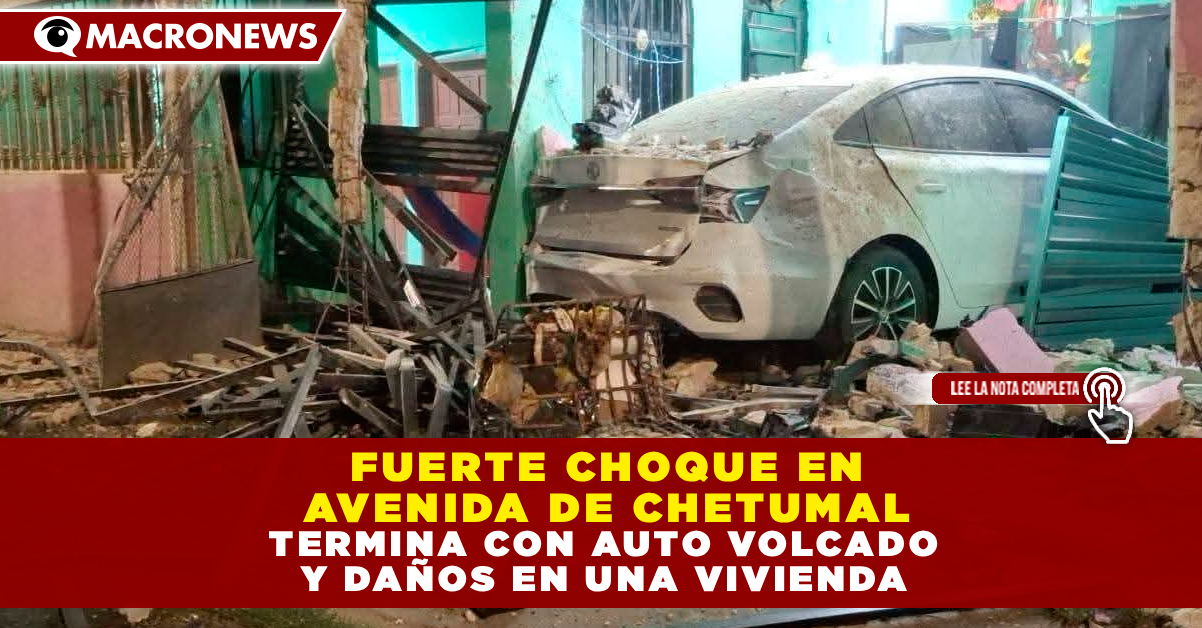 CHETUMAL, Q. ROO. – La madrugada de este martes, un violento accidente en el cruce de la avenida Chetumal con Campamento Vega dejó un saldo de daños materiales cuantiosos y gran alarma entre los vecinos. Tras el impacto, uno de los vehículos involucrados terminó volcado sobre su toldo en medio de la vía, mientras que la segunda unidad salió proyectada con fuerza hacia la fachada de una vivienda, derribando muros e ingresando parcialmente al inmueble.
