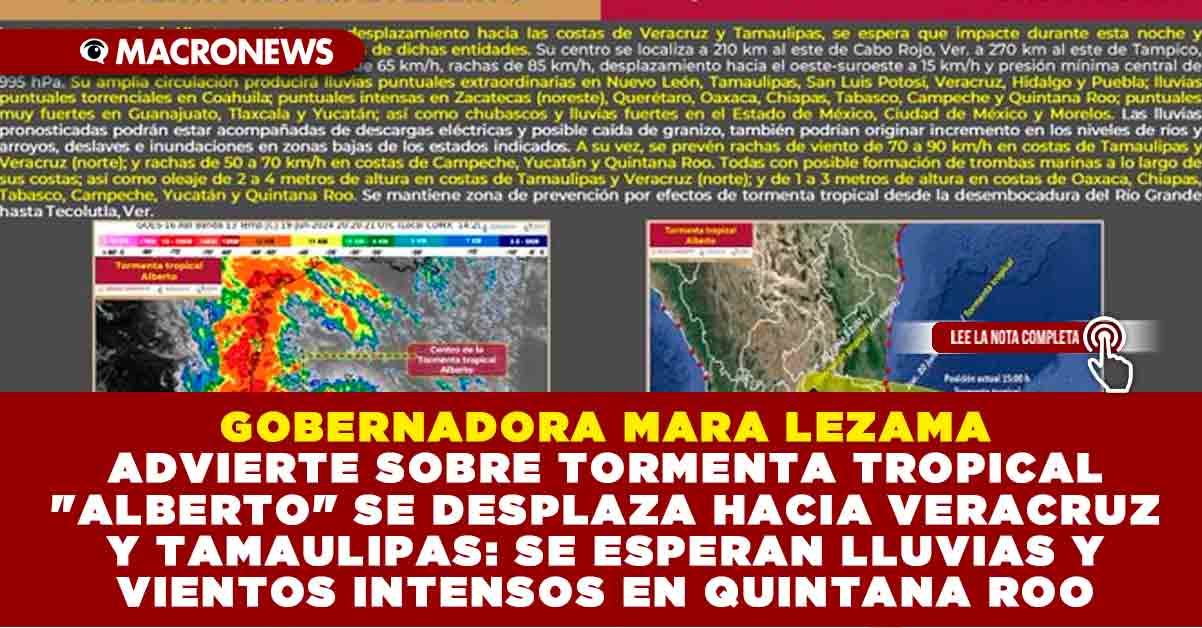 REDACCIÓN MACRONEWS-. La gobernadora de Quintana Roo, Mara Lezama, informó a través de su cuenta de Twitter sobre el avance de la tormenta tropical «Alberto», que se dirige hacia las costas de Veracruz y Tamaulipas. Se espera que la tormenta impacte durante la noche de hoy y la madrugada del jueves en los límites fronterizos de ambas entidades.