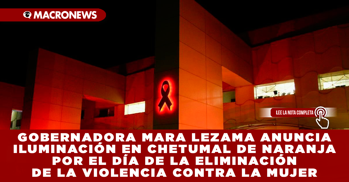 Chetumal, Q.Roo. La gobernadora Mara Lezama Espinosa utilizó sus redes sociales para informar que, en el marco del Día Internacional de la Eliminación de la Violencia contra la Mujer (25N), se iluminaron de color naranja la Megaescultura y el Centro de Convenciones en Chetumal.