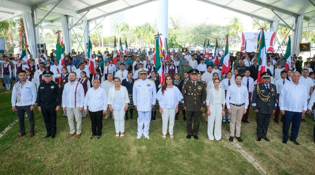 Cancún.- En el marco del 205 (ducentésimo quinto) aniversario del Día de la Bandera, la gobernadora Mara Lezama Espinosa encabezó en Cancún la ceremonia cívica conmemorativa, donde convocó a las juventudes a asumir un papel activo en la construcción de la paz todos los días, el respeto y la unidad nacional.