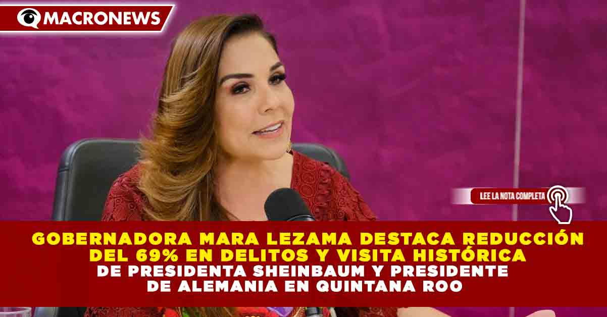 Redacción Macronews.- La gobernadora de Quintana Roo, Mara Lezama Espinosa, resaltó durante el programa “La Voz del Pueblo” la reducción del 69.3% en la incidencia delictiva, equivalente a más de seis mil delitos menos, así como la visita histórica de la presidenta Claudia Sheinbaum Pardo y del presidente de Alemania, Frank-Walter Steinmeier, como símbolo de confianza y estabilidad en la entidad.