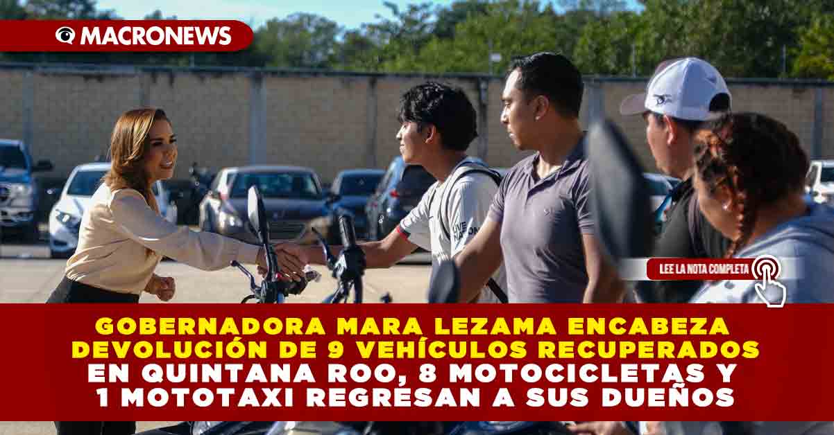 Redacción Macronews.- La gobernadora de Quintana Roo, Mara Lezama, informó a través de sus redes sociales la devolución de nueve vehículos recuperados, como resultado de los filtros de seguridad instalados en el estado, entre los que se encuentran 8 motocicletas y 1 mototaxi, reafirmando que denunciar al 911 sí funciona y es clave para la recuperación del patrimonio de las familias.