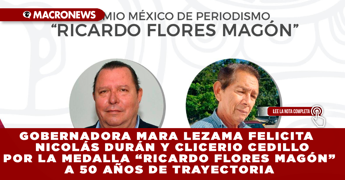 CANCÚN, Q. ROO. La gobernadora Mara Lezama Espinosa utilizó sus redes sociales para felicitar a los periodistas Nicolás Durán y Clicerio Cedillo por recibir la medalla “Ricardo Flores Magón 2025”, un reconocimiento otorgado por la Federación de Asociaciones de Periodistas Mexicanos (FAPERMEX) y el Colegio Nacional de Licenciados en Periodismo (CONALIPE).