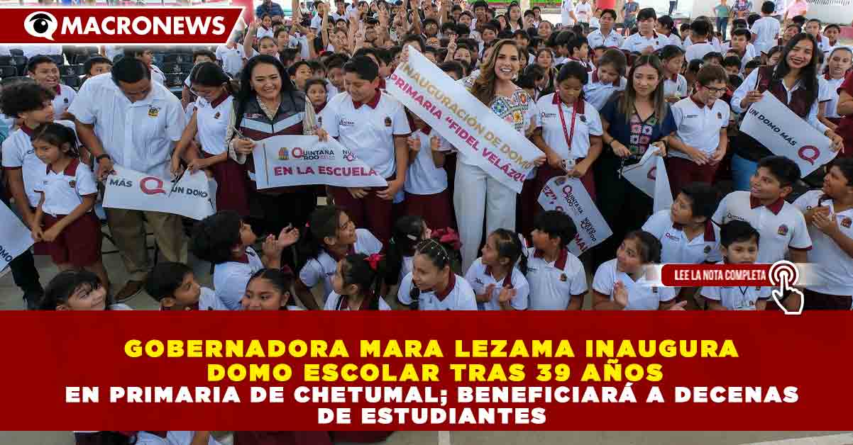 Redacción Macronews.- La gobernadora de Quintana Roo, Mara Lezama, inauguró un nuevo domo en la escuela primaria “Fidel Velázquez”, ubicada en Chetumal, una obra que se concreta 39 años después de la creación del plantel y que permitirá a las y los estudiantes realizar actividades cívicas, deportivas y culturales en un espacio protegido del sol y la lluvia.