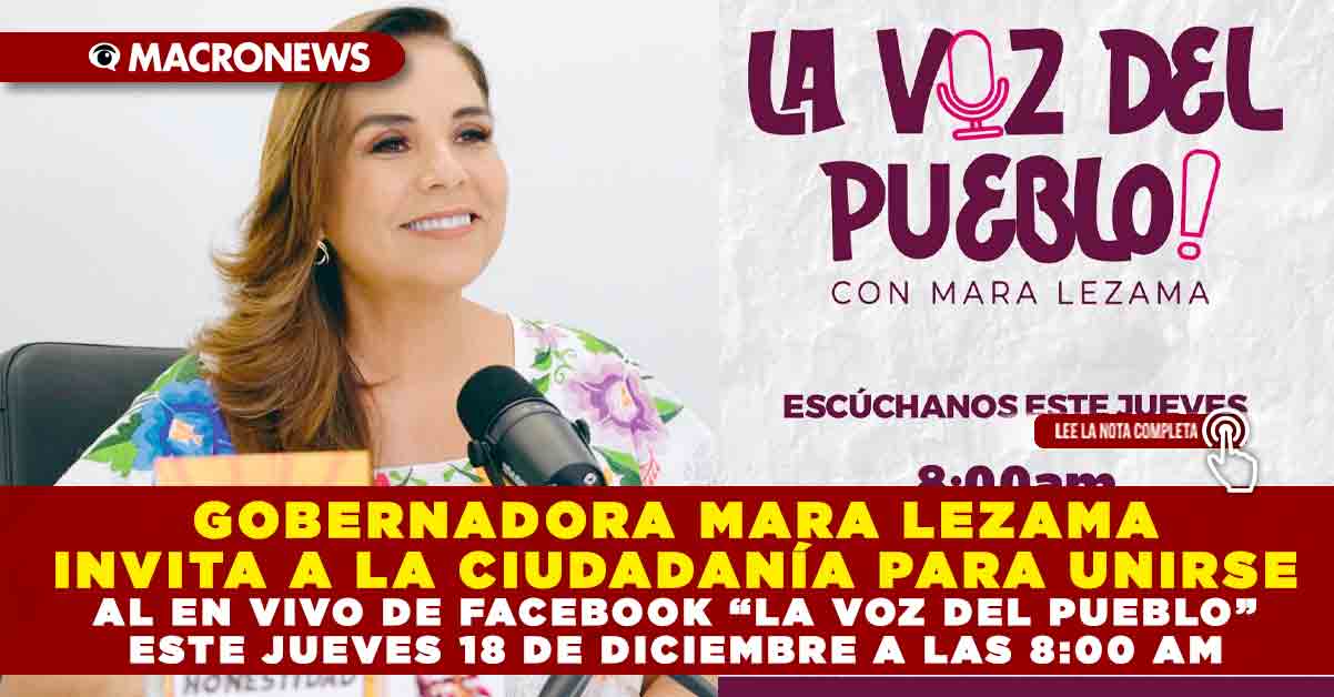Redacción Macronews.- La gobernadora de Quintana Roo, Mara Lezama Espinosa, convocó a la ciudadanía a participar este jueves 18 de diciembre en una nueva emisión del programa #LaVozDelPueblo, transmitido en vivo por Facebook Live a partir de las 8:00 de la mañana, donde escuchará directamente las inquietudes, solicitudes y comentarios de las y los quintanarroenses.