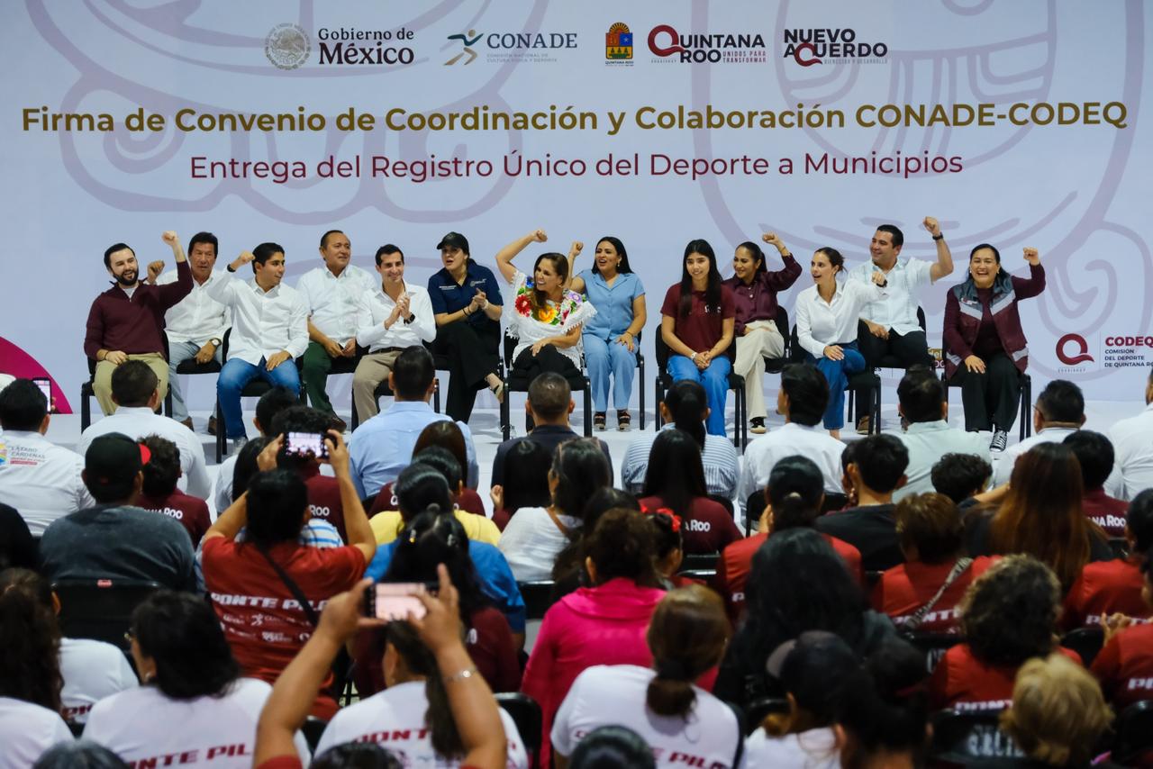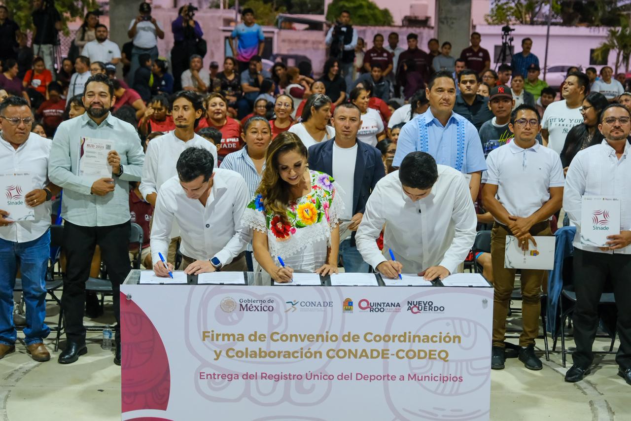 En una auténtica fiesta deportiva en la Unidad Deportiva Los Gemelos, la gobernadora Mara Lezama Espinosa y el titular de la Comisión Nacional de Cultura Física y Deporte (CONADE), Rommel Pacheco, encabezaron la firma de un convenio de coordinación que busca transformar el deporte en Quintana Roo.