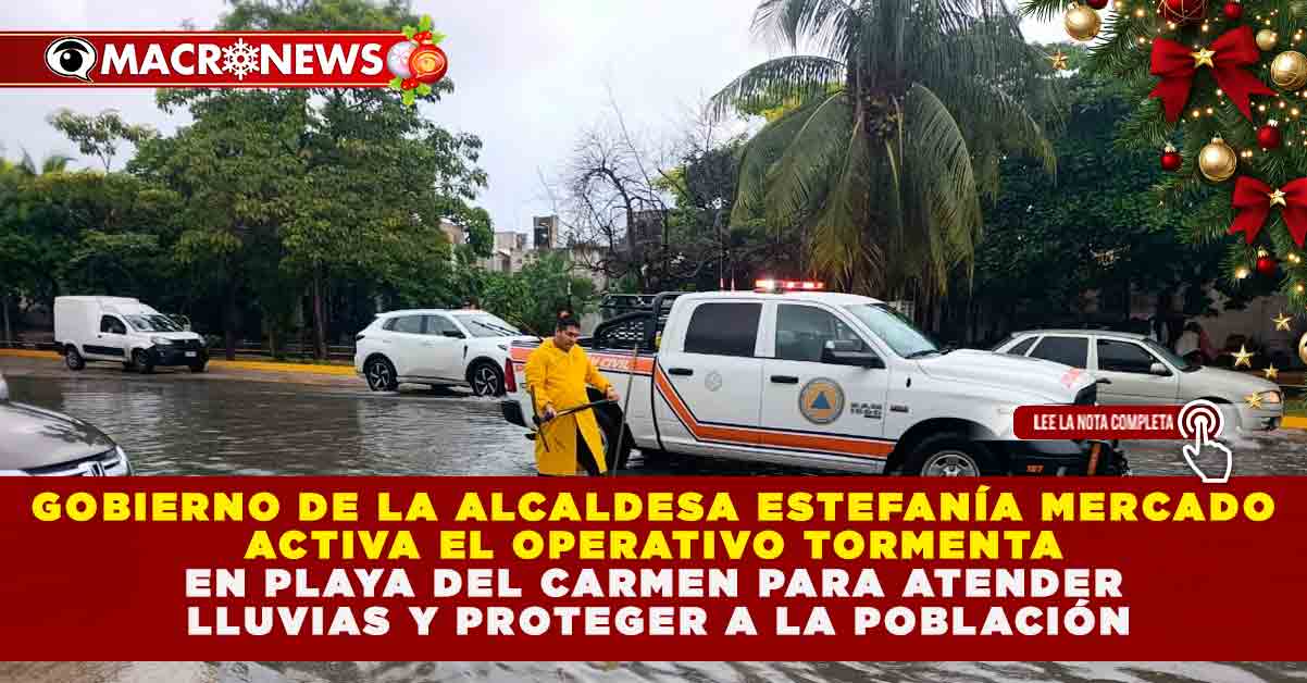 Redacción Macronews.- Playa del Carmen, Quintana Roo, 19 de diciembre de 2025.— Ante las intensas lluvias registradas en la ciudad, el gobierno municipal encabezado por la presidenta Estefanía Mercado activó el Operativo Tormenta, con el objetivo de salvaguardar la integridad de la población y atender de manera inmediata cualquier situación de riesgo que pudiera derivarse de las condiciones meteorológicas.