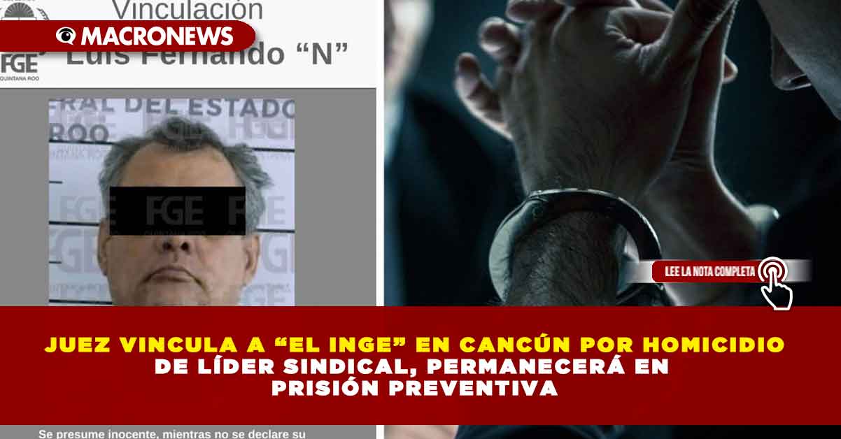 Vinculan a El Inge en Cancún por un juez de control. El detenido fue identificado como Luis Fernando “N”, por su presunta responsabilidad en el homicidio calificado de un líder sindical, ocurrido el 4 de agosto de este año. La decisión se tomó tras analizar los datos de prueba presentados por la Fiscalía General del Estado (FGE), a través de la Fiscalía Especializada en Combate al Delito de Homicidio.