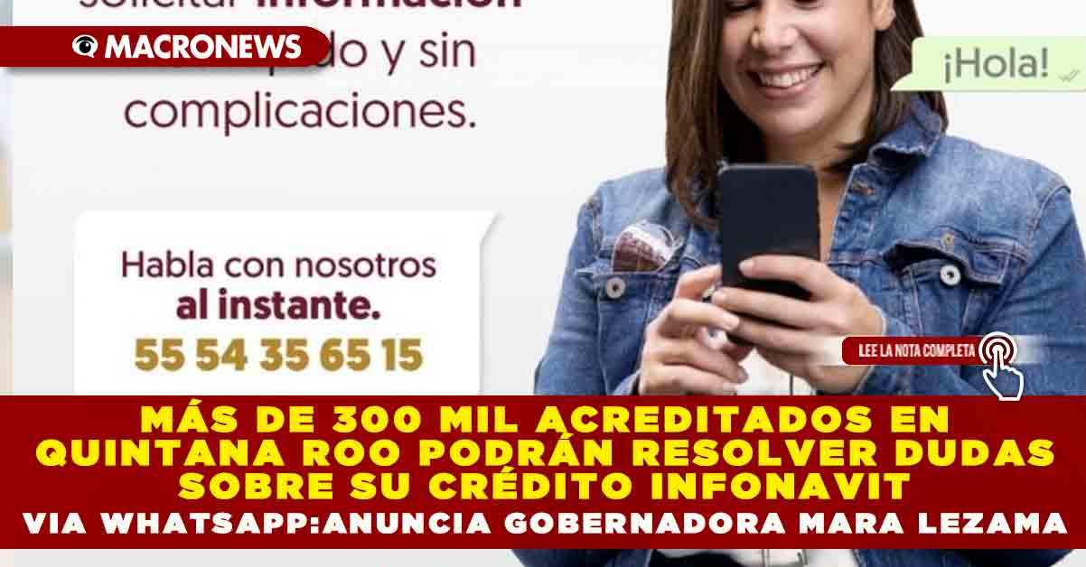 Redacción Macronews.- La gobernadora de Quintana Roo, Mara Lezama Espinosa, compartió en sus redes sociales una herramienta clave para los más de 300 mil acreditados del Infonavit en el estado: una línea de atención directa vía WhatsApp para resolver dudas sobre trámites, pagos, aclaraciones y cualquier tema relacionado con su crédito de vivienda. El número habilitado es el 55 5435 6515, y está disponible para brindar asesoría personalizada, rápida y segura.