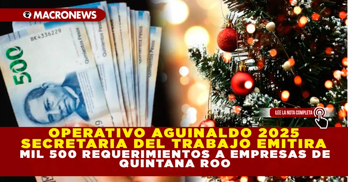 Redacción Macronews.- La Secretaría del Trabajo y Previsión Social (STyPS) en Quintana Roo anunció que iniciará operativos de verificación a partir de este lunes, emitiendo alrededor de mil 500 requerimientos a empresas para garantizar el cumplimiento del pago del aguinaldo en 2025, cuya fecha límite es el 20 de diciembre.
