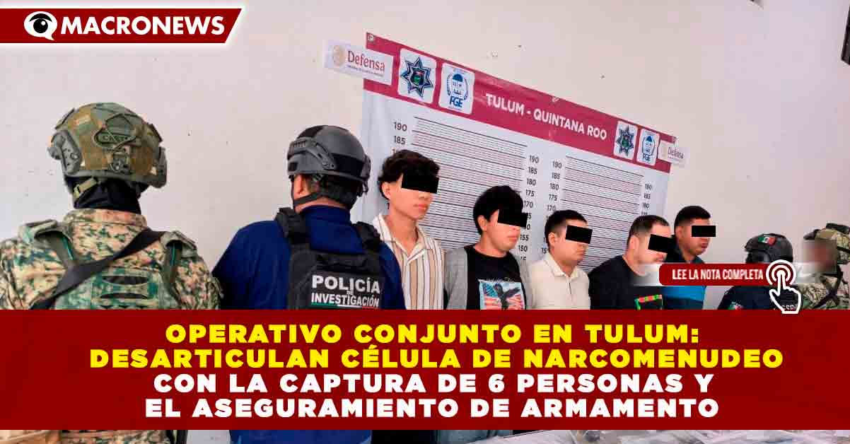 Redacción Macronews.- En una acción estratégica que refuerza el compromiso con la seguridad en la Riviera Maya, la Fiscalía General del Estado (FGE) de Quintana Roo, en coordinación con la Secretaría de la Defensa Nacional (Sedena) y la Policía Municipal de Tulum, lograron la captura de seis personas presuntamente vinculadas a delitos contra la salud. El operativo, resultado de trabajos de inteligencia y vigilancia en zonas de alta prioridad, permitió el aseguramiento de dos armas de fuego de alto calibre, tres cargadores abastecidos y una cantidad significativa de narcóticos. Con esta intervención, las autoridades logran retirar de las calles dispositivos bélicos y sustancias ilícitas que forman parte del 100% de los indicios puestos a disposición del Ministerio Público para el deslinde de responsabilidades.