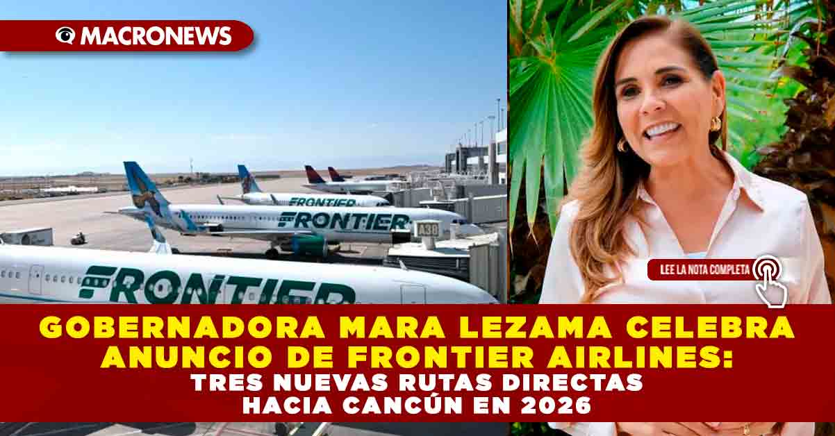 Redacción Macronews.- La gobernadora de Quintana Roo, Mara Lezama, compartió en sus redes sociales el anuncio de Frontier Airlines, que a partir de marzo de 2026 conectará a Cancún con tres nuevas ciudades de Estados Unidos: Charlotte (Carolina del Norte), Chicago Midway (Illinois) y Raleigh-Durham (Carolina del Norte).