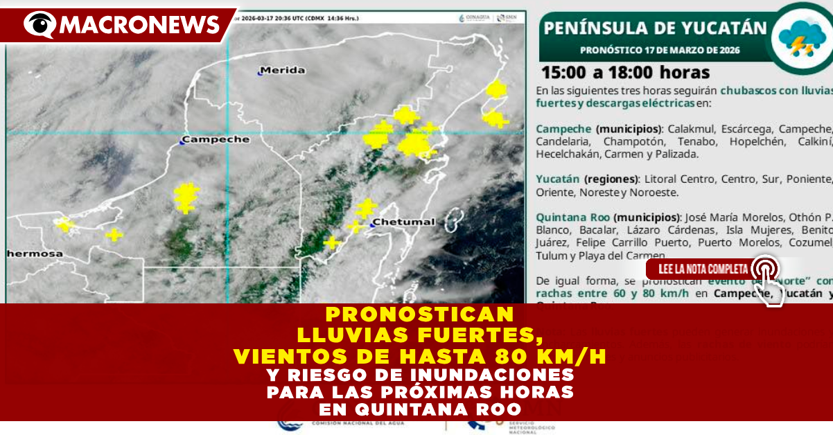 CANCÚN, Q. ROO. – Las autoridades meteorológicas han emitido un aviso urgente para la tarde y noche de este martes. Se prevé que, en las próximas horas, las lluvias se intensifiquen en diversos municipios del estado, acompañadas de un evento de «Norte» con rachas de viento que oscilarán entre los 60 y 80 km/h. Estas condiciones climáticas elevan el riesgo de incidentes urbanos y afectaciones severas en la infraestructura.
