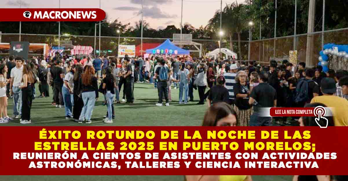 Redacción Macronews por Santiago Ramírez.- Puerto Morelos celebró con gran participación la Novena Edición local y la Décimo Séptima a nivel Latinoamérica de la Noche de las Estrellas 2025, una jornada dedicada a la divulgación científica que reunió a familias, estudiantes y entusiastas de la astronomía en el parque deportivo de la colonia Pescadores.