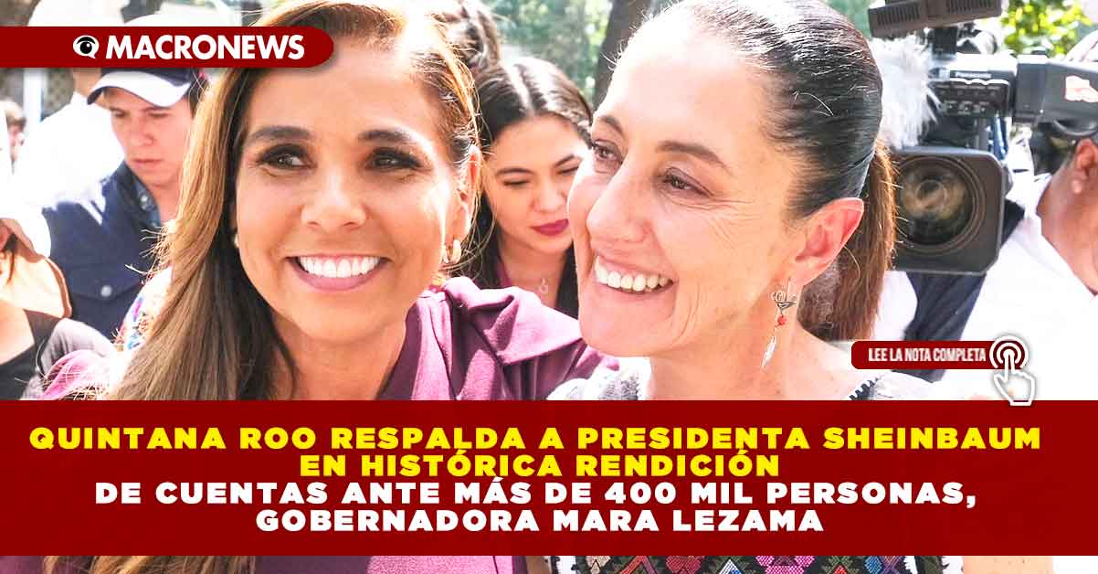 Ciudad de México.- “Desde Quintana Roo apoyamos a la Presidenta de México, Claudia Sheinbaum, en el acto histórico de rendición de cuentas “La Transformación Avanza” ante más de 400 mil personas en el zócalo de la Ciudad de México, afirmó la gobernadora Mara Lezama Espinosa.