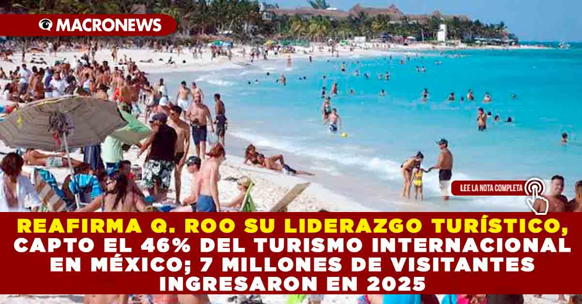 Redacción Macronews.- Quintana Roo reafirma su liderazgo turístico al captar el 46% del turismo internacional que llega a México, según datos de la Secretaría de Turismo. De los 15 millones 96 mil viajeros que arribaron al país en los primeros nueve meses de 2025, 7 millones 21 mil ingresaron por el Aeropuerto Internacional de Cancún, consolidando al Caribe Mexicano como la principal puerta de entrada para visitantes extranjeros.