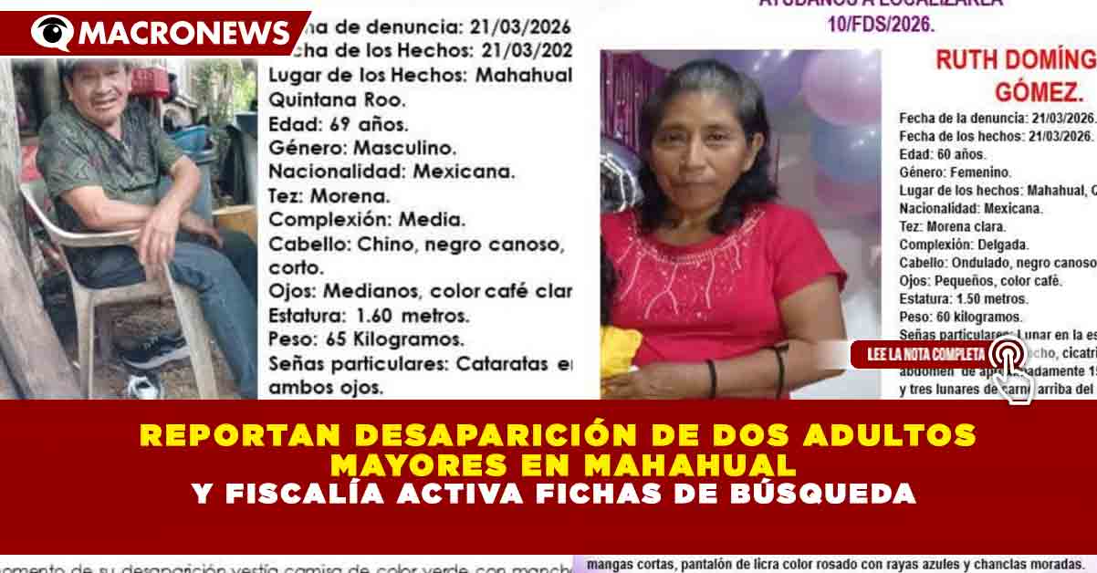 Redacción Macronews.- La desaparición de dos adultos mayores en la comunidad de Mahahual encendió las alertas de las autoridades, luego de que la Fiscalía General del Estado de Quintana Roo activara fichas de búsqueda para dar con su paradero.