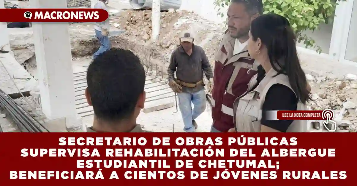 Redacción Macronews.- Por instrucciones de la gobernadora Mara Lezama Espinosa, el secretario de Obras Públicas de Quintana Roo, Arq. José Rafael Lara Díaz, realizó la supervisión de la obra de “Rehabilitación de la Segunda Etapa del Albergue Estudiantil de Chetumal”, un espacio que brinda alojamiento y apoyo a jóvenes provenientes de comunidades rurales que cursan sus estudios en la capital del estado. La acción forma parte del compromiso del Gobierno estatal de ofrecer instalaciones seguras, dignas y funcionales, fortaleciendo la educación pública y el desarrollo integral de la juventud.