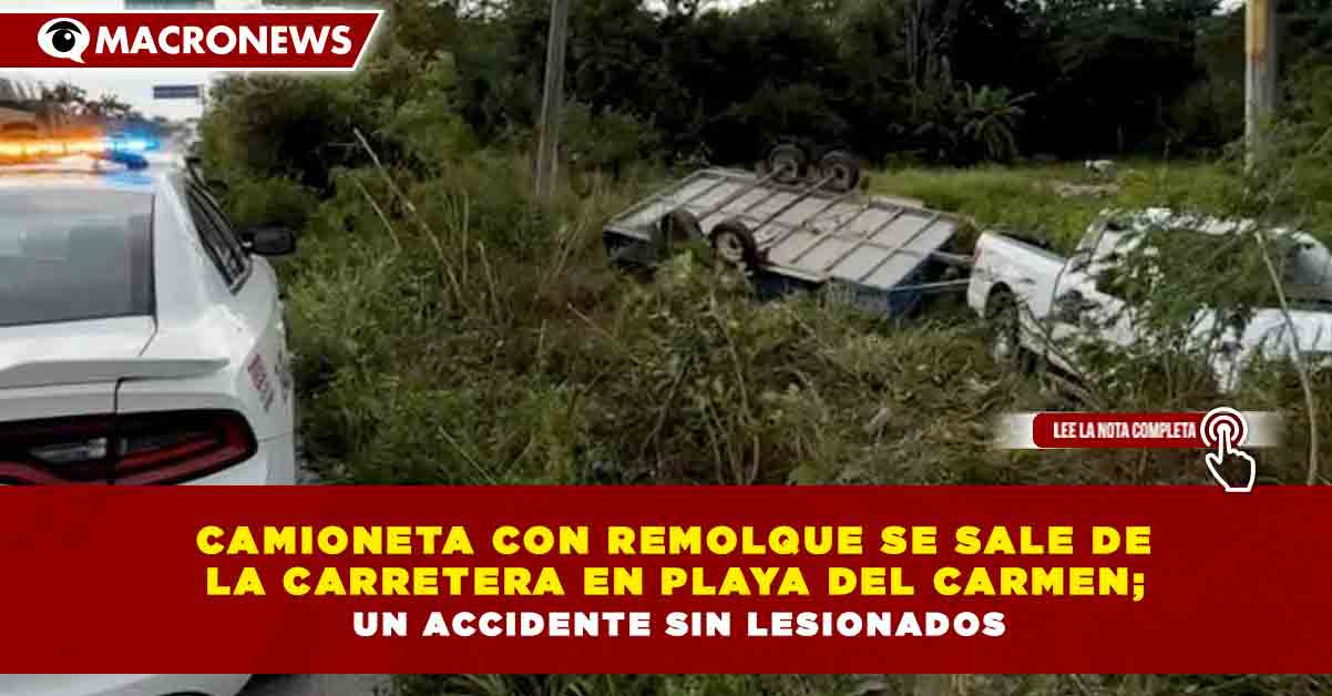 Redacción Macronews.- Una camioneta que circulaba con remolque se salió de la carretera al llegar a Playa del Carmen, provocando un accidente que generó movilización de cuerpos de emergencia y afectaciones momentáneas a la vialidad, sin que se reportaran personas lesionadas.