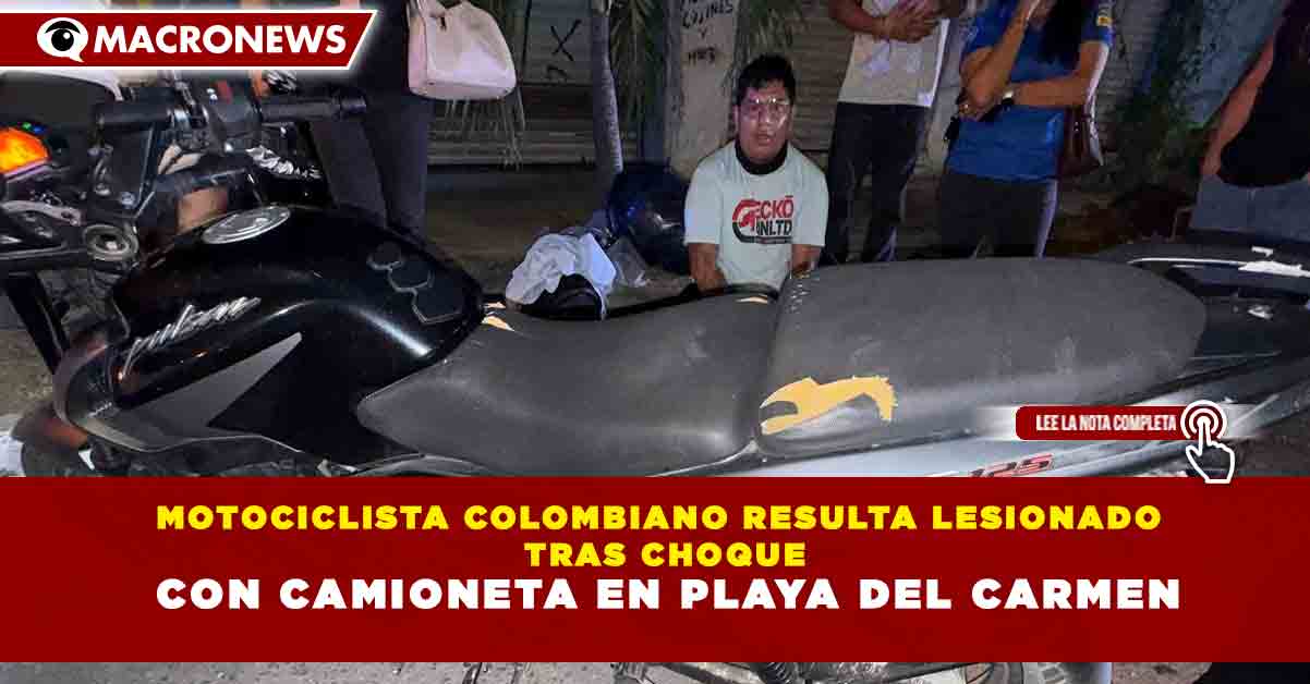 Redacción Macronews.- Un motociclista de nacionalidad colombiana resultó lesionado luego de impactarse contra una camioneta en un accidente vial registrado en Playa del Carmen, donde se reportó 1 persona herida y 2 vehículos involucrados, movilizando a cuerpos de emergencia y autoridades de tránsito.