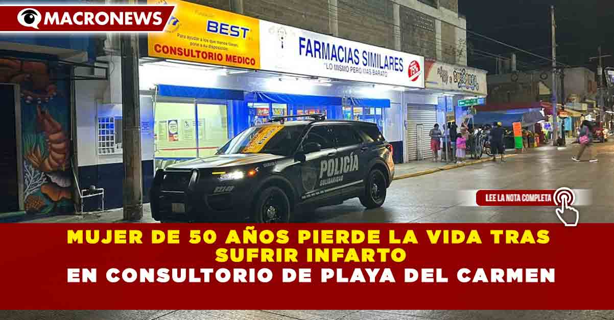 Redacción Macronews.- Una mujer de aproximadamente 50 años de edad falleció la tarde de este martes tras sufrir un aparente paro cardíaco fulminante mientras se encontraba en un consultorio médico de una farmacia ubicada en el fraccionamiento Villas del Sol, en Playa del Carmen.
