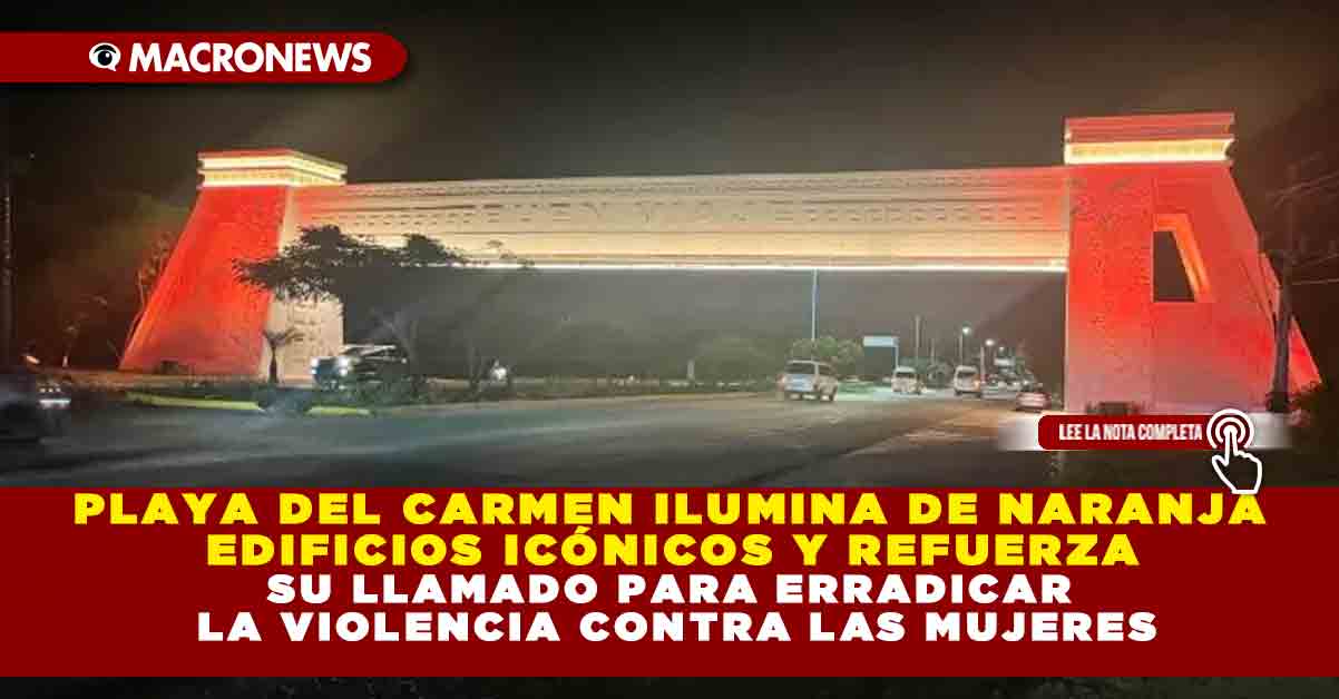 Playa del Carmen.— En un gesto de unión y conciencia social, el Ayuntamiento de Playa del Carmen iluminó de color naranja el Arco de Acceso Norte y el Palacio Municipal, con motivo del Día Internacional para la Eliminación de la Violencia contra la Mujer.